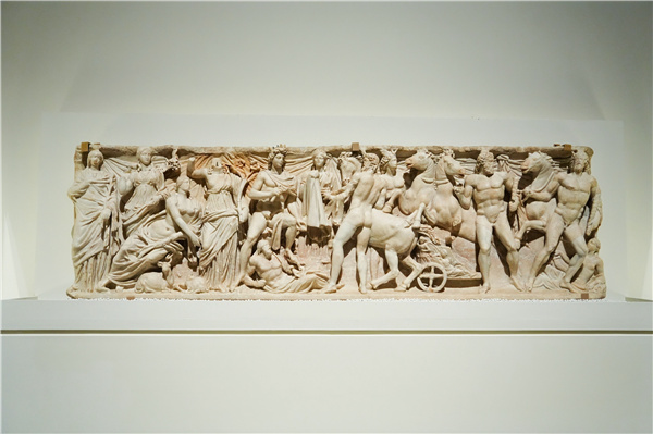 浮雕描绘的是法厄同恳求太阳神赫利俄斯(或为阿波罗)借给他太阳车的场景。但因其无法驾驭太阳车,导致大地焦灼,最终宙斯以雷电击毁战车,法厄同身亡。该类型的罗马石棺常置于墙壁或壁龛中,因此只装饰正面和两侧。