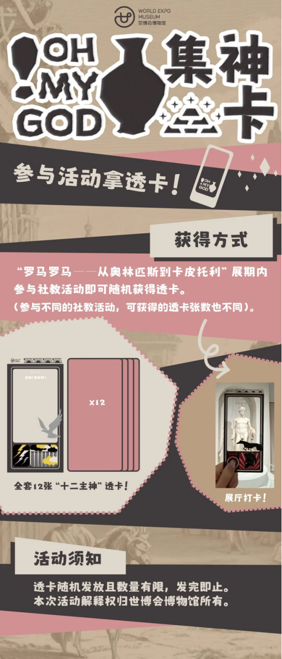 参与罗马展社教活动,集十二主神透卡!参与本次活动可随机抽取透卡一张,快用透卡和罗马神们一起合影吧!