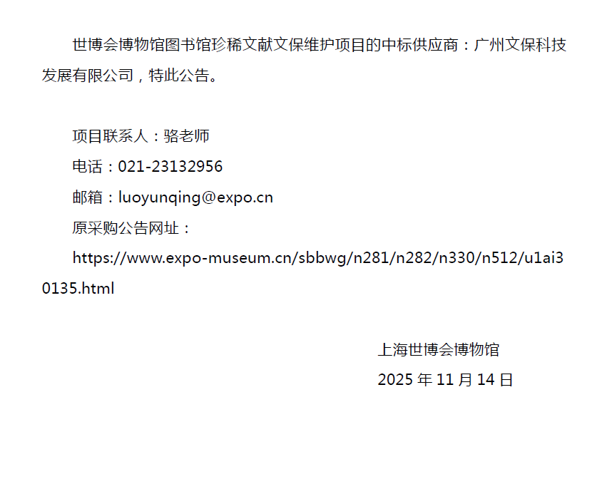 世博会博物馆图书馆珍稀文献文保维护项目中标公告