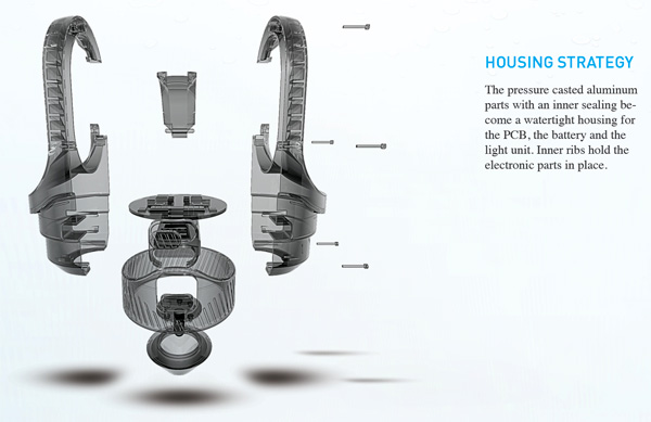瓶子上部主要有两个压铸铝部件、内部密封件组成。密封空腔里布置了PCB板、LED灯、紫外装置和电池。