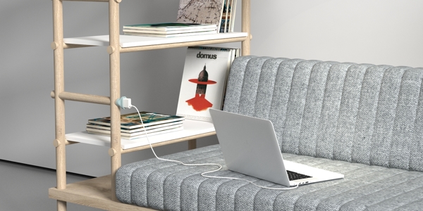 设计师在把沙发的两个扶手变成了两个多功能搁架,搁架上面可以放置杂志和其他杂物。在搁架的右侧上面还有一个半圆支架,上面有一个台灯,这样一来你就可以坐在沙发上,不用起身就可以开关台灯、取放杂志。
