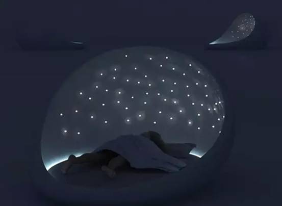 懒癌患者的明显症状之一就是能坐着的时候绝对不站着,而能躺着的时候也绝对不会坐着——躺也是一种放松。俄罗斯设计师Natalia Rumyantseva带来的宇宙睡床设计,具有如同星光一般治愈性照明和芳香系统,会帮助你舒缓压力。