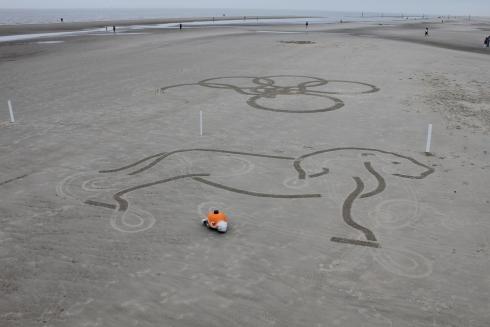 迪斯尼实验室与瑞士苏黎世一所大学的三个学生共同研发了一个沙画机器人—BeachBot,它有0.6米长,高宽均为0.4米,由两个后轮来驱动,前轮用来控制方向,外壳采用全封闭式设计,确保沙粒不会飞进机器内部。尾部的七个沙把用来在沙地上画出图案,沙把由伺服电机驱动,BeachBot最小可以画出5cm,最大可以画出与体积一样宽的线条。通过软件预设好图案后就会自动转化成BeachBot的沙画轨迹,最终BeachBot会自动在沙滩上画出放大数百倍的预设图案。