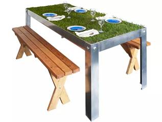 这款餐桌的设计是要满足人们在家也能享受野餐的乐趣,桌面上那些是真的一个小型草坪,再也不怕水洒在桌子上难处理了。