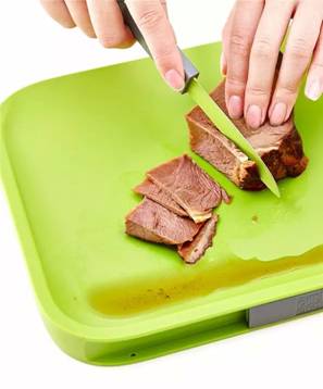 可折叠滤网砧板是一款创新的产品,当折叠的时候,它的一端成了一个滤网,可将食物收拢,清洗、滤水,然后平摊开来,它又是一款造型独特的砧板,用于切菜。可谓一举两得!