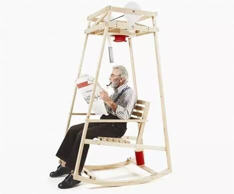 当你坐在舒适的摇椅上晃动时,摇椅上的自动针织机会巧妙的利用这个动能让齿轮开始转动,只要你有足够多的休息时间呆在这张摇椅上,以及有足够多的摇摆,或迟或早,你总会得到一顶由自动针帽机为你编织而成的针织帽。