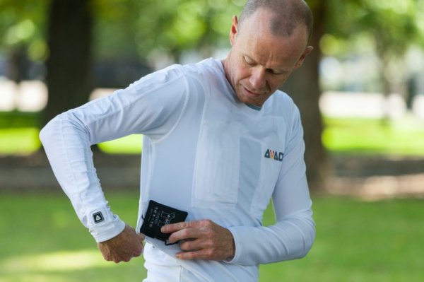 乍一看Avade好像和大多数长袖运动装没什么区别,用聚酯氨纶混纺做成,目的是让它在轻、耐穿、紧身及芯吸作用上达到最佳平衡。再细看你会发现三个用线编织成碳纤维的加热元件(两个在胸前一个在背部正上方),右手袖口有一个按钮,臂下是电池袋。电线从袖口外面连接电池和按钮,再绕到胸部两个加热点,继续走到背部的加热点,不过衣服外观看起来没有描述得这么复杂。