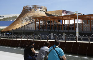 日本馆:日本馆以天然竹子和木头为建材,同时强调和谐与科技。策划的活动和装置用意在刺激五感,日本馆以“和谐多样”为主题,提出日本饮食文化可作为健康、永续及平衡的饮食范例,并建议日本饮食文化可作为减轻饥饿及全球生态问题的模式。日本馆建筑仿京都传统房屋,入口宽敞,作纵向延伸。使用竹子、木头等天然材料,展馆正中央的木头不仅仅是建筑结构的一部分,更象征了如植被、森林等自然元素,而“自然的睿智”又正是2005年日本爱知世博会的主题。森林与植被被视为从陆地到海洋的生命循环中不可或缺的一部分。树木代表着与日本里山的关联,里山是日本丘陵地带的农业区。自然森林区在传统上常被用于耕种稻米、竹子和其他代表性产品。里山在当今被视为日本的自然遗产。