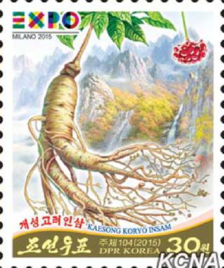 据朝中社7日报道,朝鲜为纪念参加意大利米兰世博会,发行了1枚新邮票。纪念邮票上印有朝鲜特产——开城高丽人参。